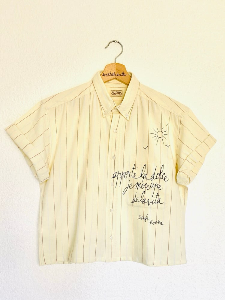 ♥️Pièce unique créée en collaboration avec la talentueuse poétesse Sarah Avena ♥️ Chemise vintage chinée, peinte à la main au pinceau et à l’encre textile, coupée courte
