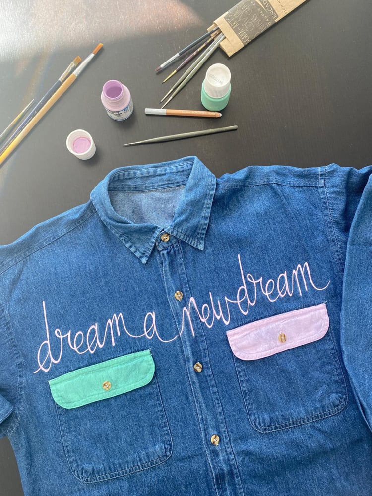 Chemise vintage en jean brut, peinte à la main au pinceau et à l’encre textile.
