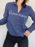 Très jolie chemise liquette en lin peinte à la main au pinceau et à l’encre textile. Coupe femme - Pièce unique.
