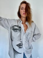Chemise vintage chinée, peinte à la main au pinceau et à l’encre textile.